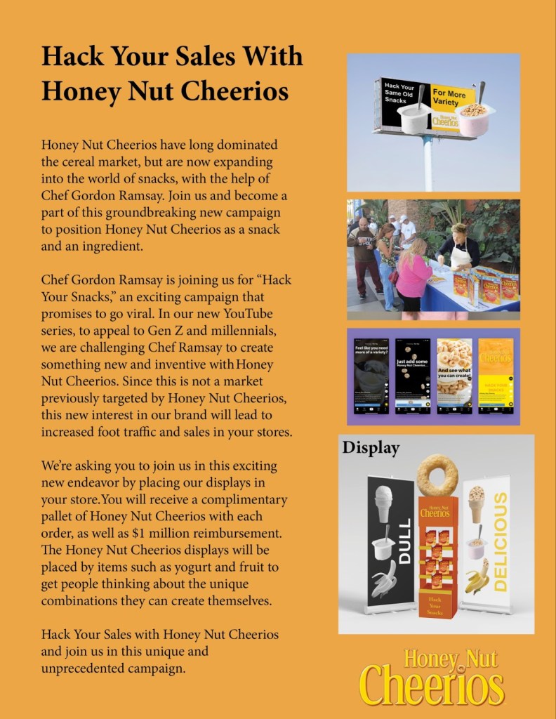 This page offers just a glimpse into a campaign for Honey Nut Cheerios. Created with a team, this project aimed to market Honey Nut Cheerios to college students, who seldom eat breakfast. College students enjoy inexpensive food options that don’t require much preparation, making Honey Nut Cheerios a great option for snacking.