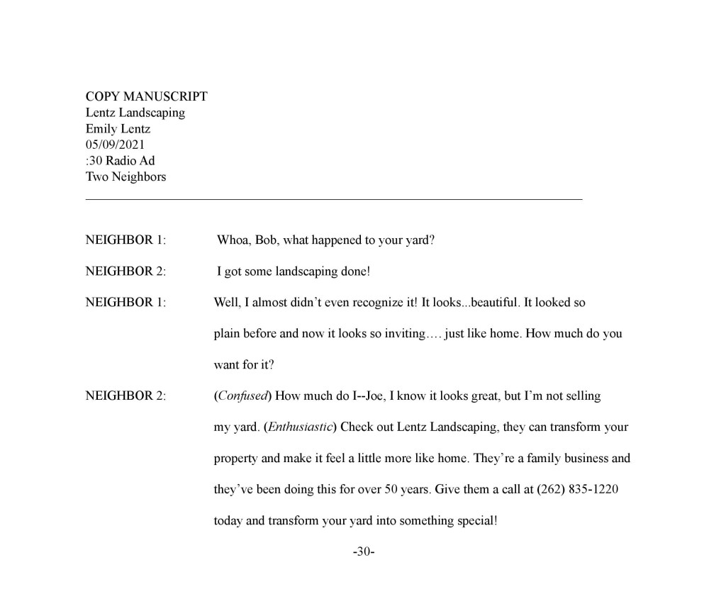 Yes, Lentz Landscaping is a real business. Located in Caledonia, WI, my grandfather’s landscaping business has been working with local residents and businesses for over 50 years. This radio ad script is intended to bring attention to the business in a lighthearted way that will resonate with an older audience.